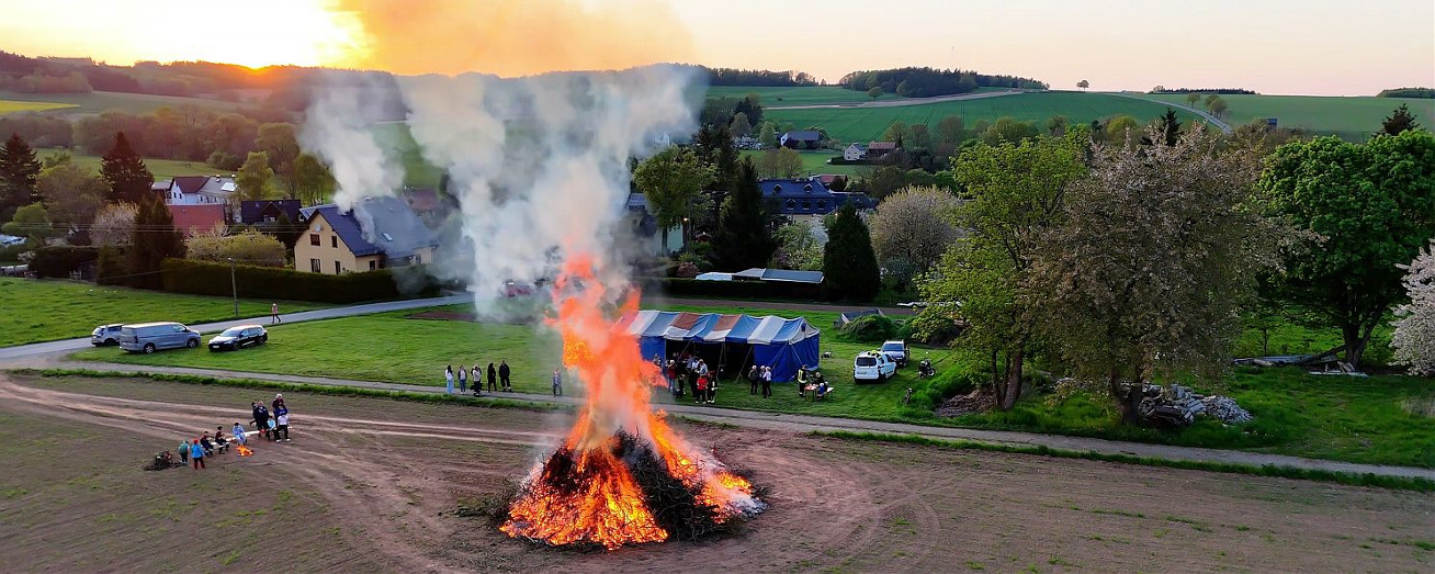 Bei der vom Ortschaftsrat organisierten Aufräumaktion „Gemeinsam geht’s besser“ wurde die Befestigung des Maibaums mit neuer Farbe versehen. Der Maibaum wurde zuvor von der Feuerwehr aus den heimischen Wäldern sorgfältig ausgewählt und von der Rinde entfernt. Die Tobertitzer Mädels bindeten den Maikranz. Nachdem der Maibaum aufgestellt wurde, begann für die Kinder der spannende Teil des Abends: nach Anzünden der Fackeln. Es bildete sich ein kleines Meer aus Feuer, welches seinen Weg bis an den Ortsausgang gefunden hat. Dort angekommen hatten die Tobertitzer in den vergangenen Tagen ordentlich Holz für ein großes Feuer angesammelt. Auch eine Hexe war dieses Jahr wieder vertreten. Diese wurde von einigen Jungendlichen unseres Dorfs gebaut. Sie brauchten dafür etwa zwei Tage und das schwierigste sei der Kopf gewesen– alles andere wäre recht einfach gewesen. Nach dem Entzünden des Feuers konnte im Zelt noch fleißig gegessen, getrunken und gequatscht werden.